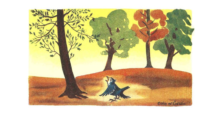 Ḃí éinín boċt ag siúl tríd an gcoill. Ḃí